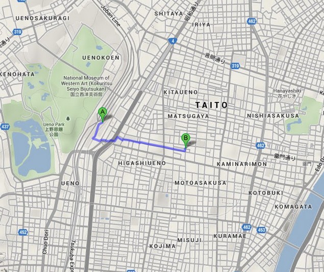 จากโรงแรมที่พัก (ที่จุด A) ไปยังตลาดอาเมโยโกะ (ที่จุด B) ระยะประมาณ 1 กิโลเมตร แต่คราวนี้เราจะลองไปขึ้นรถไฟฟ้า ที่สถานีอินาริโจ (Inaricho) และ ไปขึ้นที่สถานีอุเอโนะ (Ueno) และเดินไปตลาดอาเมโยโกะกันค่ะ