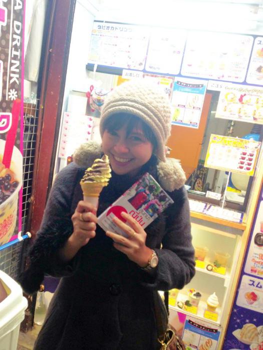 จ่ายเงินเสร็จ ออกมานอกร้าน อุณหภูมิ 12 องศา เจอไอศรีมซอฟโคน รสช๊อกโกแล็ต-กล้วย ถึงกับต้องจัดไป 1 อัน ราคา 300 เยน (96 บาท) อันนี้แอบแพงค่ะ