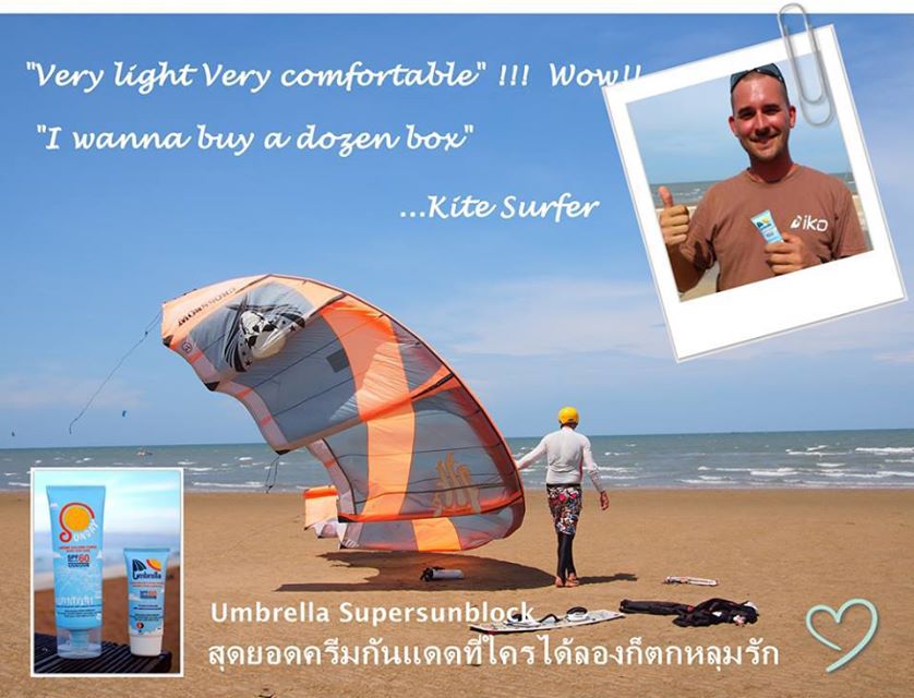 หลังจากให้นักเล่น Kitesurfing ระดับครูสอนได้ลอง Umbrella ครีมกันแดด ตัวสุดท้ายของคุณ ก็ได้ข้อความข้างบนยืนยัน เอสเองไปทะเล ถ้าไม่มี Umbrella และ Sunday กันแดด ทาหน้าและทาตัวดีๆ แบบนี้ เอาไม่อยู่แน่นอน ส่วนใครสนใจไปลองเล่น Kitesurfing ที่ปราณบุรี กดดูข้อมูลลิงค์นี้ได้เลยค่ะ http://www.kite-thailand.com/