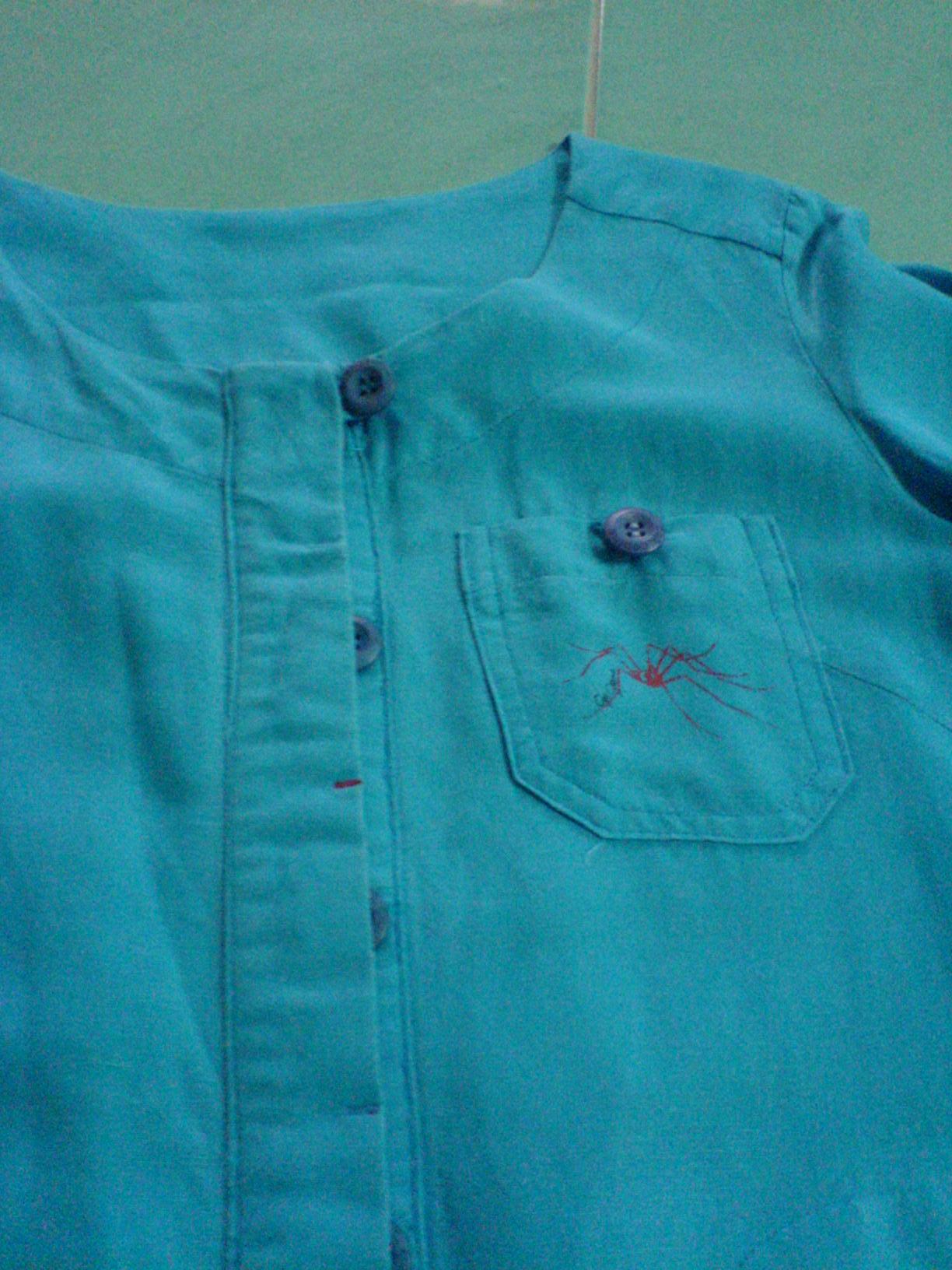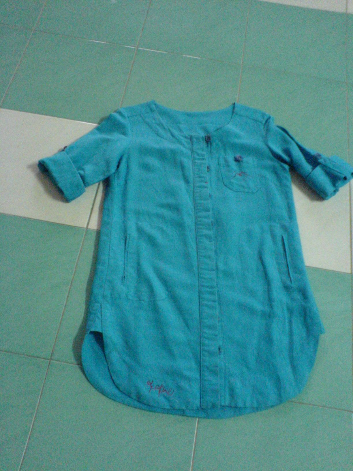 เสื้อตัวยาว สีฟ้าเข้ม ผ้าลินิน คอกลม กระเป๋าด้านข้าง 2 ใบ ผ่าหน้ากระดุมซ่อน เล่นสีกระดุมที่แขนและกระเป๋า ด้านหลังจับจึบ ปักลาย ราคา 300 บาท
