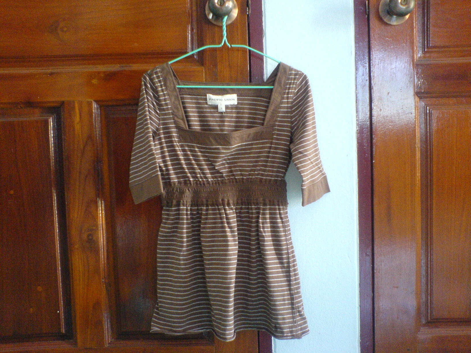เสื้อยืดสีน้ำตาล แขนสามส่วน สม๊อครอบอก size L รอบอกก่อนยืด 33" มือ 1 ราคา 200 บาท