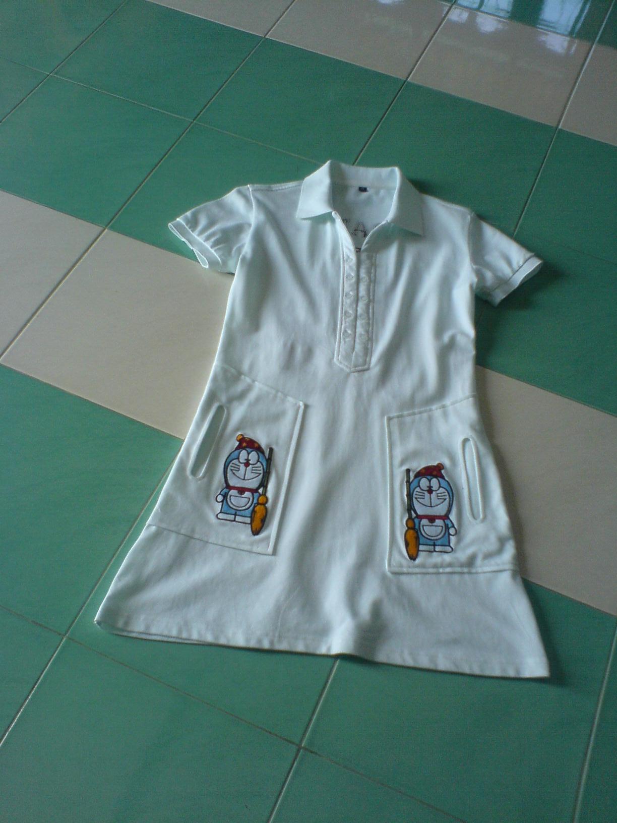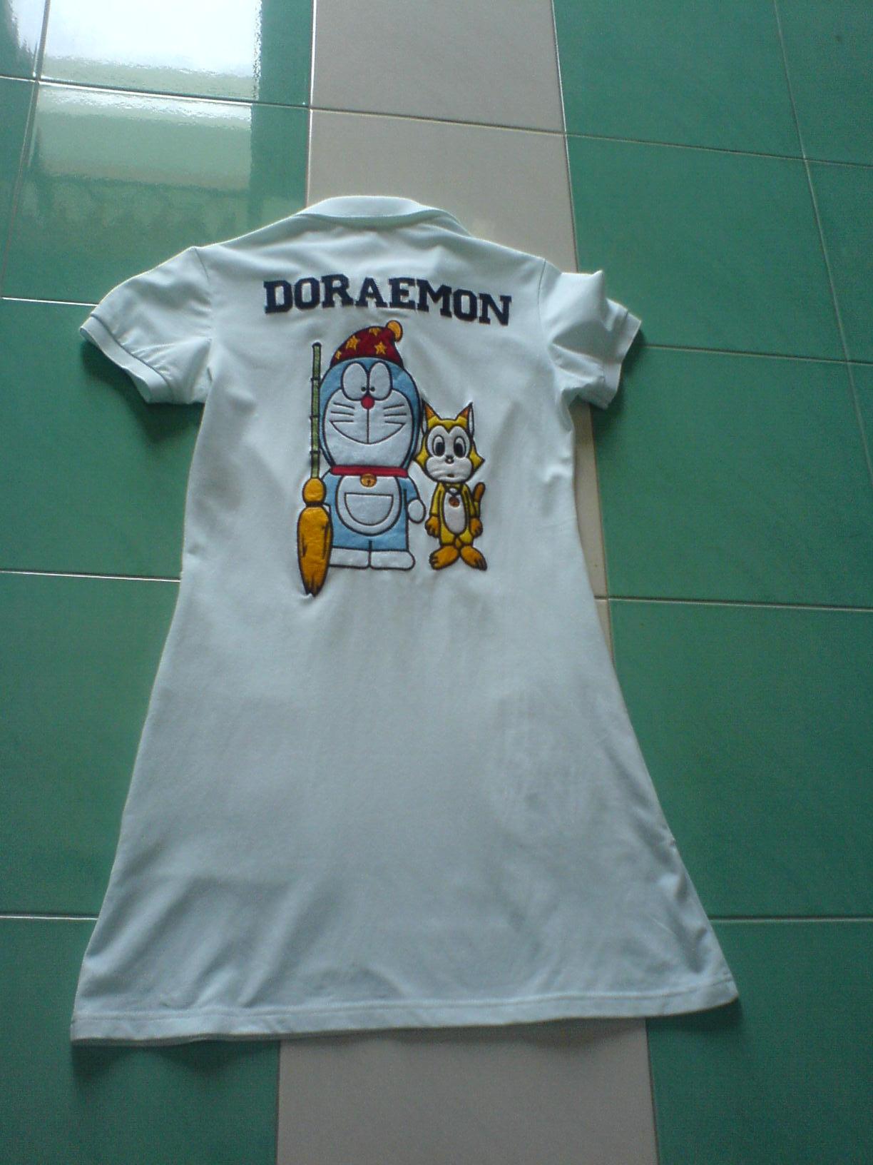 เดรสผ้ายืดสีขาว size M ลายโดเรมอน คอโปโล กระเป๋าข้าง 2 ใบ แบบน่ารัก ราคา 300 บาท