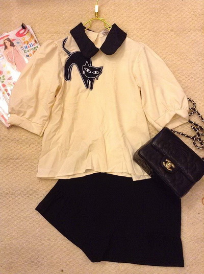 -สภาพ 100 % (ยังไม่ใส่ ไม่มีตำหนิใดๆทั้งสิ้น) เสื้อแขนสามส่วนลายแมว ที่อกปัก สีครีม แต่ปกคอสีดำสวยมากผ้านิ่มมากก ไม่บาง คะ