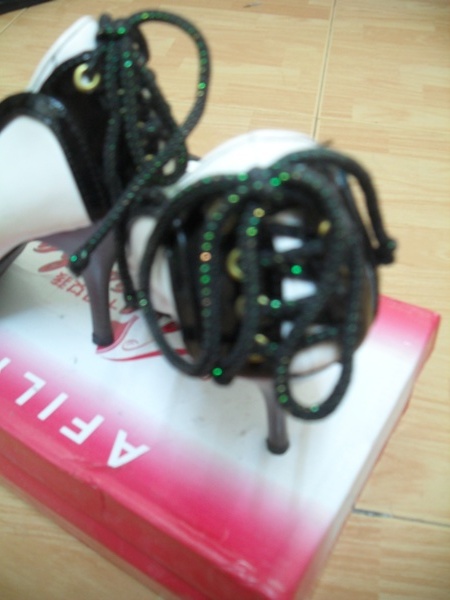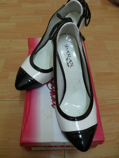 รองเท้าส้นสูงสีขาว-ดำ(มือหนึ่ง) ไซต์ 36-37 สูงประมาณ 3 นิ้ว ส้นเป็นไม้ๆตรงด้านหลังเป็นเชือกผูกๆดูเปรี้ยวมาก ราคา 120 บาท