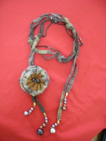 เส้นแรกเป็นมุกสีชมพู ซ้อนกัน 3 เส้น มีเข็มกลัด(เอาออกได้)เป็นดอกไม้ ขนนก ประดับ
