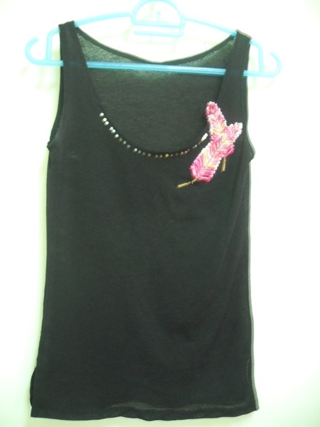 เสื้อซีทรูสีดำ(มือสอง) ตรงคอเสื้อปักเลื่อมๆและลายขนนกกำมะหยี่สีชมพู ราคา 100 บาท