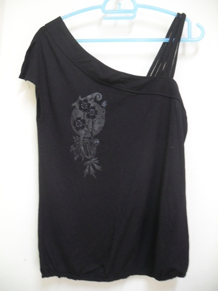 เสื้อ FQ&Lสีดำ(มือหนึ่ง) แขนสองข้างไม่เหมือนกันอธิบายไม่ถูกตามรูปเลยค่ะ หน้าอกสกรีนลายและปักลูกปัด ราคา 100 บาท