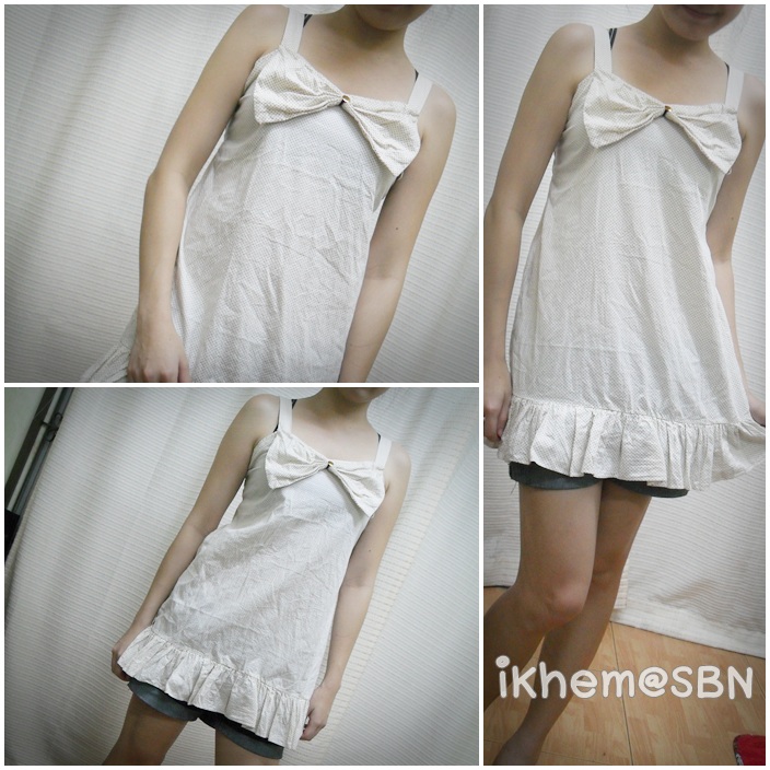 เสื้อสายเดี่ยวสีครีมลายจุดเล็กๆ(มือสอง) มีโบว์ตรงหน้าอก ชายตกแต่งระบาย ใส่กับกางเกงขาสั้นหรือเลกกิ้งก็ได้ ราคา 150 บาท(ส่งลงทะเบียนฟรี)