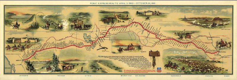 แผนที่การให้บริการ Pony Express หนึ่งในบริการ ที่ใช้คนขี่ม้าทำหน้าที่ส่งข้อมูล ในช่วงปี 1860 - 1861 (ขอบคุณรูปภาพจาก http://en.wikipedia.org/wiki/Pony_Express)