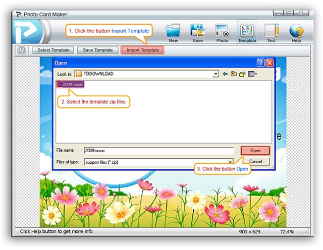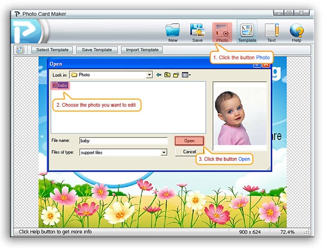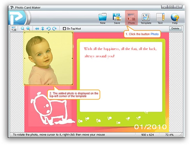 นอกจาก Template ที่โปรแกรมมีให้แล้ว เราสามารถนำภาพถ่ายของเราเอง มาเพิ่มลงไปในการ์ดได้ด้วย