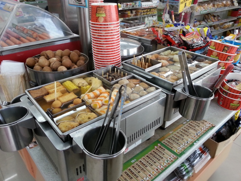 ตู้ลักษณะนี้ จะเห็นได้แทบทุกร้านสะดวกซื้อค่ะ จะมีตู้โอเด้ง อยู่กับหม้อไข่พะโล้ เราสามารถเลือกบะหมี่กึ่งสำเร็จรูปในร้าน มาใส่เครื่องโอเด้งแล้วทาน ยามท้องร้องได้ในแทบทุกร้านสะดวกซื้อค่ะ