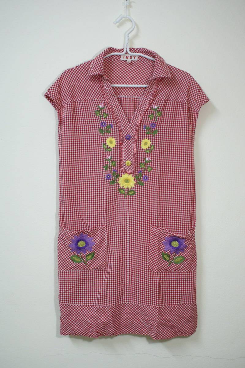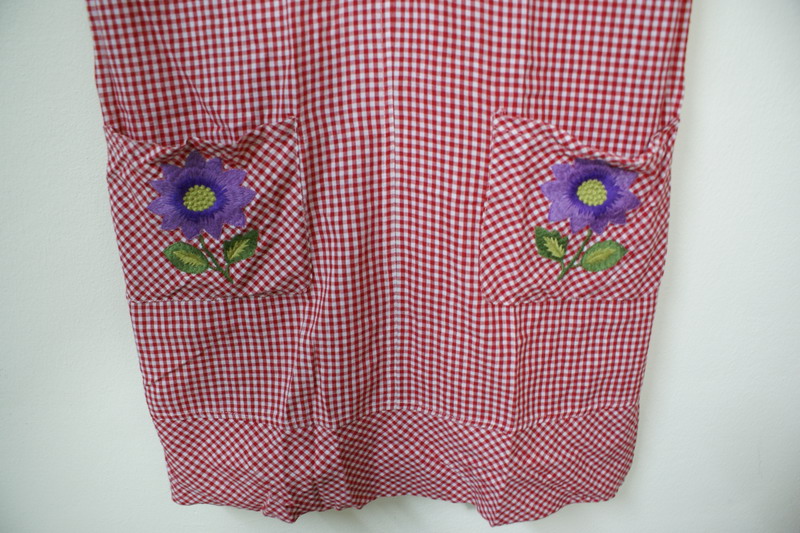 ชุดแซกสีแดง ลายตาราง คอปก มีกระเป๋าสองข้าง