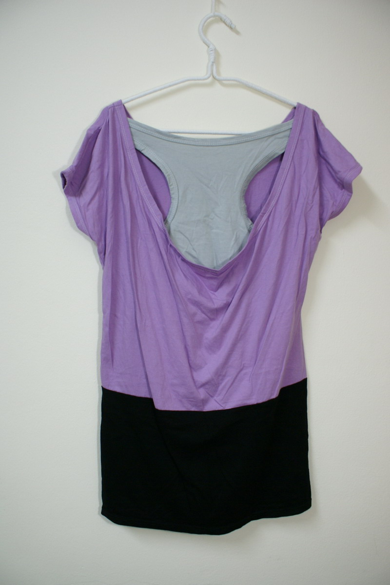 ชุดแซกสีม่วง ด้านหลังเหมือนมี 2 ชิ้น เป็นเสื้อกล้าม