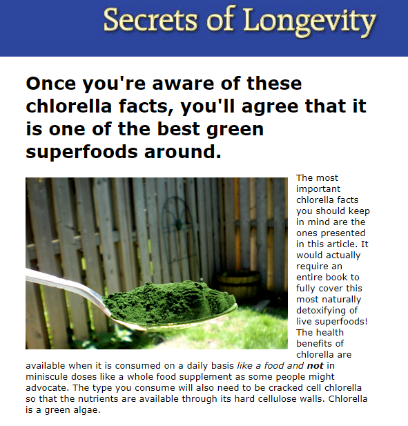 คลอเรลล่า คือ พืชธรรมชาติ ที่ผู้เชี่ยวชาญด้านการ ชะลอความแก่ และ การมีอายุยืน (Longevity) ในต่างประเทศ แนะนำให้ทาน (ส่วนหนึ่งตามภาพด้านล่าง)