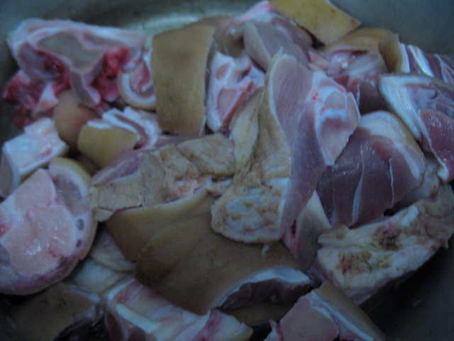 ต้มจนน้ำเดือด แล้วผมก็ใส่ขาหมูลงไป ต้มต่อไป จนน้ำเดือดพลั่กๆ ซักพัก