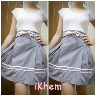 เดรสผ้าตัดต่อช่วงเสื้อเป็นผ้ายืดสีขาว ช่วงกระโปรงเป็นทรงจับจีบบานๆ ดูหวานๆ สีเทา มีสายคาดเอวผูกเป็นโบว์ ใส่ 2 ครั้ง ราคา 250 บาท