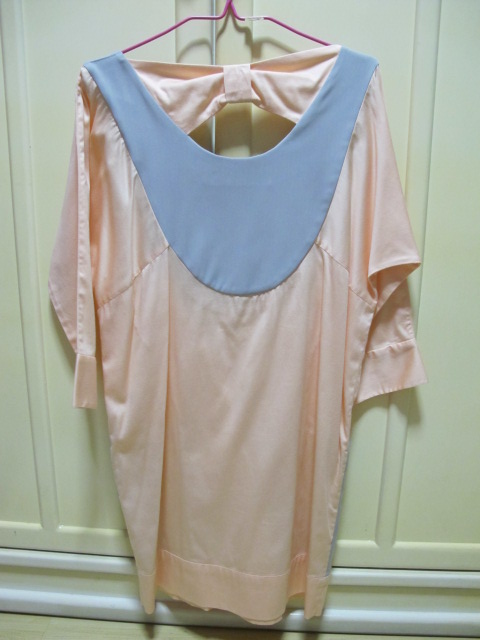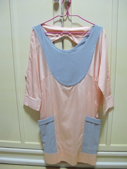 เดรสสีโอรส กระเป๋าสีเทา ผ้าดีมาก detail ด้านหลังเป็นโบว์ ขาย 300 บาท