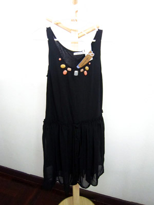 ชุดเดรสสีดำ ตกแต่งเม็ดพลอยหลายสีที่หน้าอก