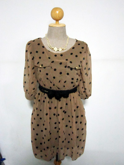 *DR001 ชุดเดรสจั้มเอวลายจุดใหญ่แขนสามส่วน (สีน้ำตาล และสีดำ)