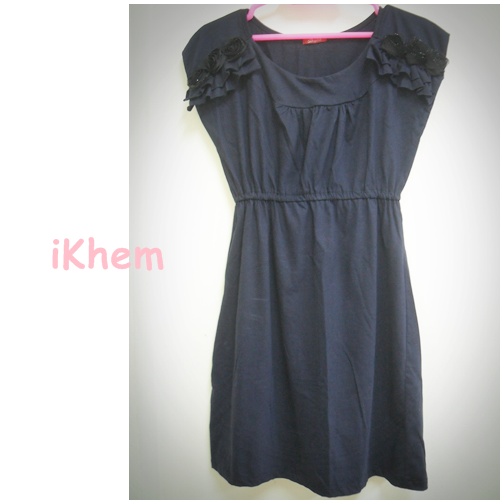 เดรสสีน้ำเงินกรมท่า ตรงบ่า 2 ข้างตกแต่งระบายและดอกไม้ จั้มเอว แค่ใส่เข็มขัดเส้นใหญ่เข้าไปก้ดูหรูแล้วจ้า ของใหม่ราคา 180 บาท เท่านั้น