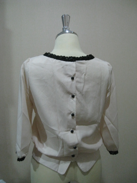 ที่คอเสื้อ และ แขนเสื้อตกแต่งลูกไม้สีดำ กระดุมยาวตลอดแนวสลับใส่หน้าหลังได้คะ