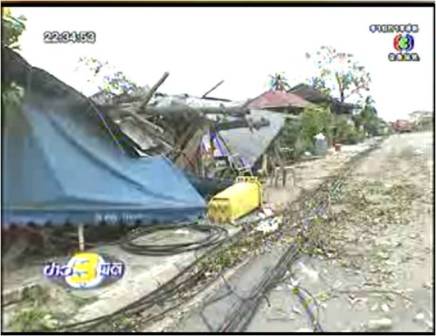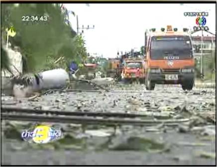 ส่วนนี่เป็นความเสียหายในเขตเทศบาลตำบลสทิงพระ เสาไฟฟ้าและต้นไม้จำนวนมากล้มขวางถนนสายหลัก