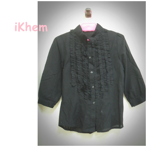 เสื้อเชิ้ตแขนสามส่วนคอจีนสีดำ ตกแต่งระบายช่วงหน้าอก ของใหม่ ราคา 150 บาท