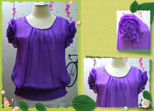 เสื้อสีม่วงผ้าชีฟองฟรีไซด์ มีซับใน ถ้าเบื่อสามารถเลาะดอกไม้ออกได้ มือหนึ่งค่ะ ขาย 229