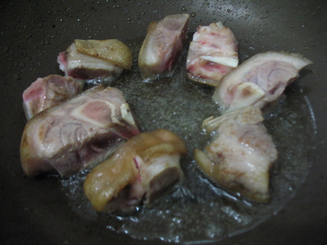 เราเริ่มด้วย ทำแกงกะหรี่ เริ่มที่ ทอดขาหมู ให้สุก แล้วพักไว้ ทิ้งให้สะเด็ดน้ำมัน