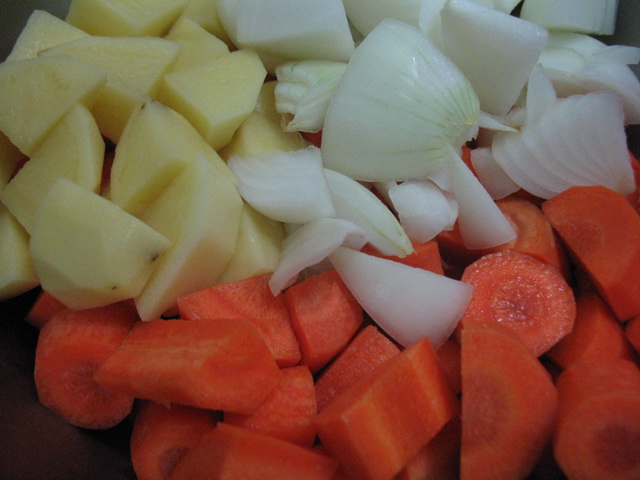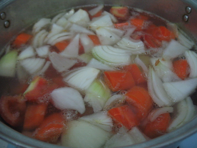พอน้ำที่ต้มไว้เริ่มเดือด เราก็ใส่ มันฝรั่ง แครอท และ หอมใหญ่ ลงไปต้มพร้อมกัน
