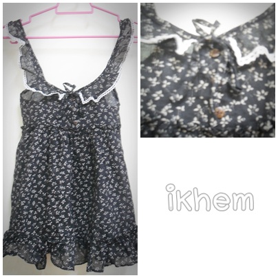 เสื้อผ้าคล้ายๆยีนส์(มือหนึ่ง) สีดำ ด้านในเป็นเสื้อเย็บติดกันสีขาว ตรงหน้าอกติดเข็มกลัดดอกไม้ซึ่งสามารถย้ายไปติดตรงอื่นได้ ข้างหลังมีสม็อคเข้ารูปค่ะ ราคาพิเศษ 100 บาท