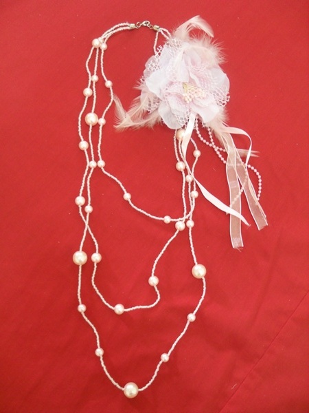 สร้อยมุกสีชมพู ซ้อนกัน 3 เส้น มีเข็มกลัด(เอาออกได้)เป็นดอกไม้ ขนนก ประดับ