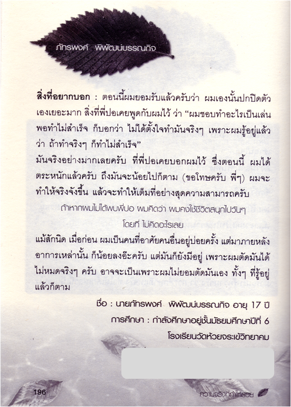 และยังได้เรียนรู้ รู้จักตนเองและยอมรับตนเองเพิ่มขึ้น อีกว่า