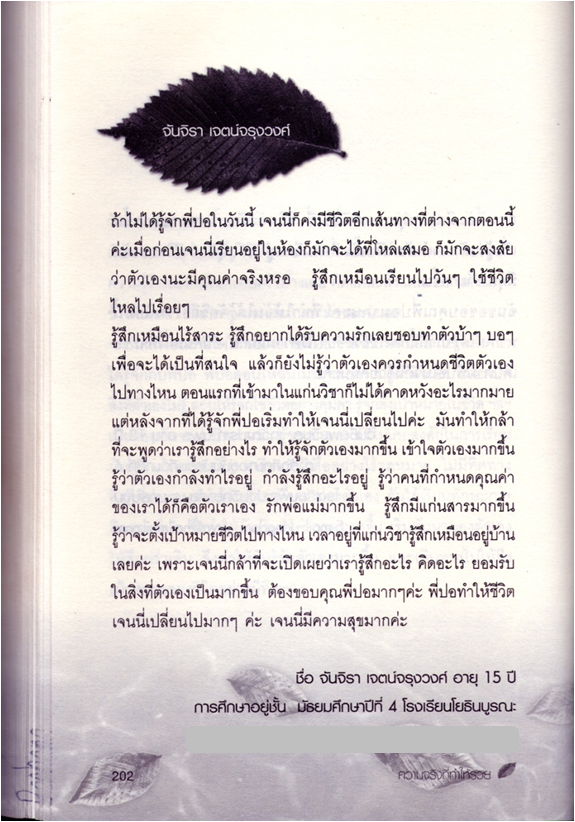 เจนนี่คิดว่าการที่เรียนแก่นวิชามีผลอย่างมากกับชีวิตเจนนี่ค่ะ คิดดูสิค่ะ ถ้าเจนนี่ไม่มั่นใจในคุณค่าตน ดูถูกตัวเองทุกครั้ง เจนนี่จะเรียนหนังสืออย่างมีความสุขได้ไงค่ะ และถ้าไม่ได้เรียนที่นี้เจนนี่คงไม่มีความมั่นใจพอที่จะกำหนดชีวิตตัวเองได้ค่ะ เพราะไม่เคยรู้สึกว่าตัวเองมีค่า