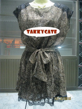 เดรสลายเสือยอดนิยม ช่วงไหล่มีผ้าลูกไม้สีดำ เอวเป็นยางยืด มีโบว์ผูกได้ทั้งด้านหน้า-หลัง มีซับในอย่างดี และชายกระโปรงเป็นระบายลูกไม้ ใส่ไปทำงานก็ได้ น่ารักมาก ของใหม่