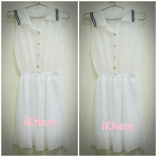 เดรสแขนกุดสีขาวสไตล์มารีน คอปกเป็นชีฟองอัดพลีท ตกแต่งแถบสีดำ กระทุมสีทอง เอวจัมพ์ กระโปรงอัทพลีทสวยงาม ตรงช่วงเสื้อไม่มีซับใน แต่ตรงกระโปรงมีซับในนะคะ ของใหม่เช่นกันจ้า ราคา 200 บาท