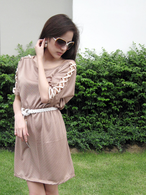Cute 3: เดรสผ้ายืด แขนเก๋ๆด้วยเชือกร้อยไขว้สีครีม ฟรีไซด์ แขนยาว 15" ราคา 420