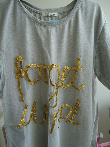 เสื้อยืดสีเทาตัวใหญ่ค่ะ มีตาข่ายแล้วก็เป็นตัวอักษรเขียนว่า for get me not