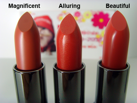 มี 3 สีค่ะ สี Alluring(หมดค่ะ) โทนส้มมีชิมเมอร์หน่อยๆ สี Beautiful(หมดค่ะ) โทนชมพูหวานมากเนื้อครีมสีจะเหมือนลิปกลอสมินิสี Beautiful ค่ะ สี Magnificent โทนชมพูนู้ดสวยๆมากๆเนื้อครีมค่ะ รูปที่ถ่ายจะเข้มกว่าของสินค้าจริงน่ะค่ะ 3 สีจะเป็นสีที่ขายดีค่ะ