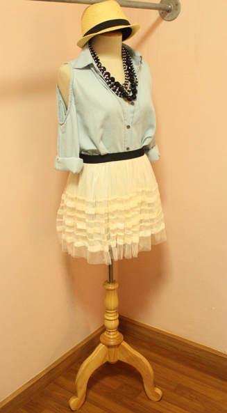 NEW NEW !!!!!414- Dress ยีนส์ เปิดไหล่ ฉลุลายที่ชายกระโปรง งานสไตล์ disaya งานดีมีซิปหลัง ตีเกร็ดรอบตัว ช่วยให้ดูผอมเพรียวค่ะ