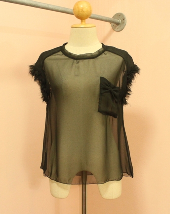 NEW NEW !!! AT003- เสื้อชีฟองแขนสั้นสีดำ รอบวงแขนระบาย กระเป๋าหน้าโบว์ งานสไตล์ดีไซต์ แบบ Topshop