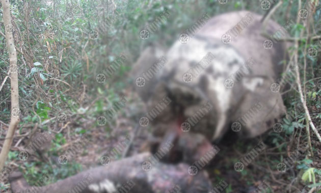 ที่บริเวณใบหน้าถูกตัดด้วยของมีคม ตั้งแต่ลูกตาลงมาจนถึงปากจนทำให้งวงขาดออกส่วนหัว และงาคู่ตัวถูกตัดหายไป พร้อมกับส่วนปลายของหางช้างป่า ก็ถูกตัดขาดหายไปโดยรอบบริเวณเป็นป่ารก โดยพบมีบาดแผล จากกระสุนปืนเป็นรูกว้าง 1 ซม. เข้าที่บริเวณปากด้านขวา 1 รู คาดเสียชีวิตมาแล้ว 2-3 วัน พบร่องรอยช้างป่าวิ่งหนีเข้ามาก่อนล้มสิ้นใจตรงจุดนี้ เป็นระยะทางเกือบหนึ่งร้อยเมตร โดยทางเจ้าหน้าได้นำกล้วยน้ำว้า ดอกไม้ ธูปเทียน จุดบอกกล่าวเจ้าที่และวางไว้ใกล้กับซากของช้างป่าตัวดังกล่าว