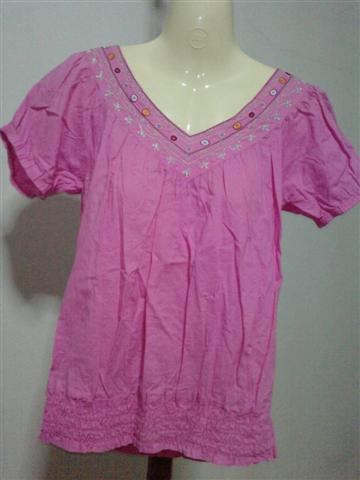 เสื้อคอวีสีชมพู ปักลายตรงคอ จั๊มเอว