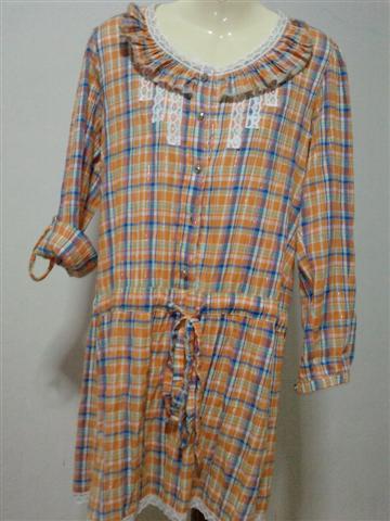 เดรสลายสก็อตสีส้ม ผูกเอว แขนยาวหรือจะพับสั้นก้อได้ มีระยายลูกไม้ตรงคอและขายกระโปรง