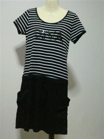 เริ่มจากเดรส เสื้อเป็นผ้ายืดลายขวางดำ-ขาว กระโปรงมีกระเป๋า 2 ข้าง ผูกเอว ใส่แล้วดูผอมเพรียว