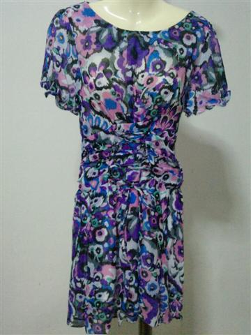 เดรสลายน้ำเงินม่วง ร้อยเชือกสลับไปมาแล้วผูกเป็นโบว์ด้านหน้า ผ้าเนื้อดี นิ่ม ลื่น ใส่สบาย