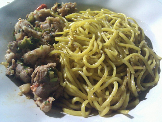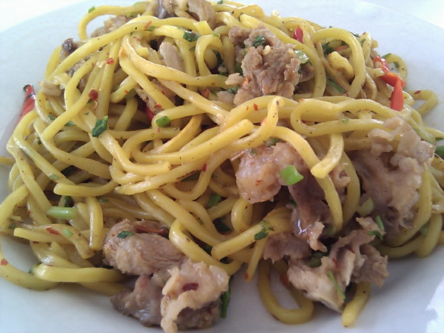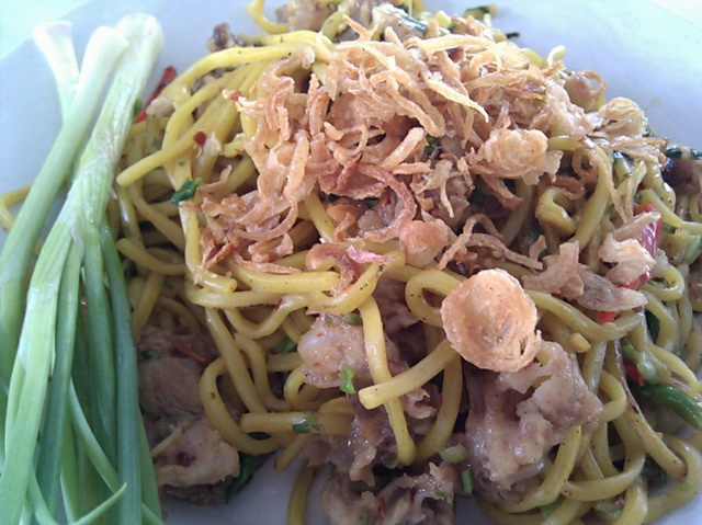 หมี่เหลืองผัดซุปแห้งหมูเปื่อย