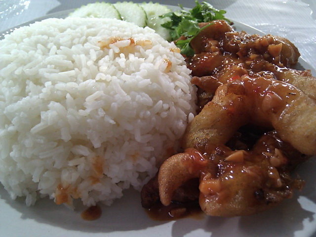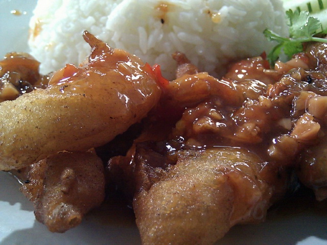 ข้าวราดปลาหมึกชุบแป้งทอดราดพริก