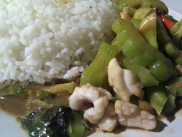 ข้าวราดปลาหมึกผัดมะระ อร่อยครับ ไม่ขมเลยล่ะ