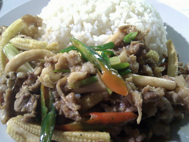 ข้าวราดหมูเปื่อยผัดเห็ดข้าวโพดอ่อน